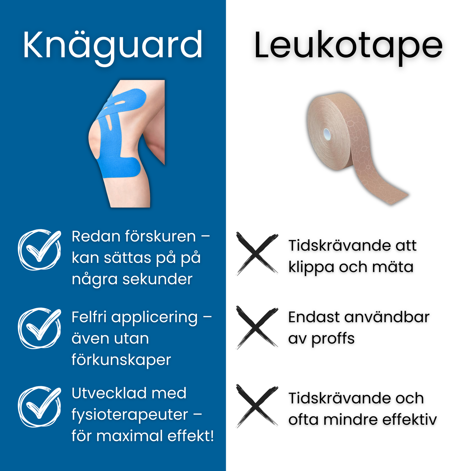 Enkelt: Du behöver inte klippa till något eller veta hur tejpen ska sättas på. KnäGuard är förskuren, ergonomiskt designad och redo att användas direkt. Det sparar tid, minskar risken för fel – och ger dig precis det stöd du behöver. Perfekt för nybörjare och en riktig gamechanger!